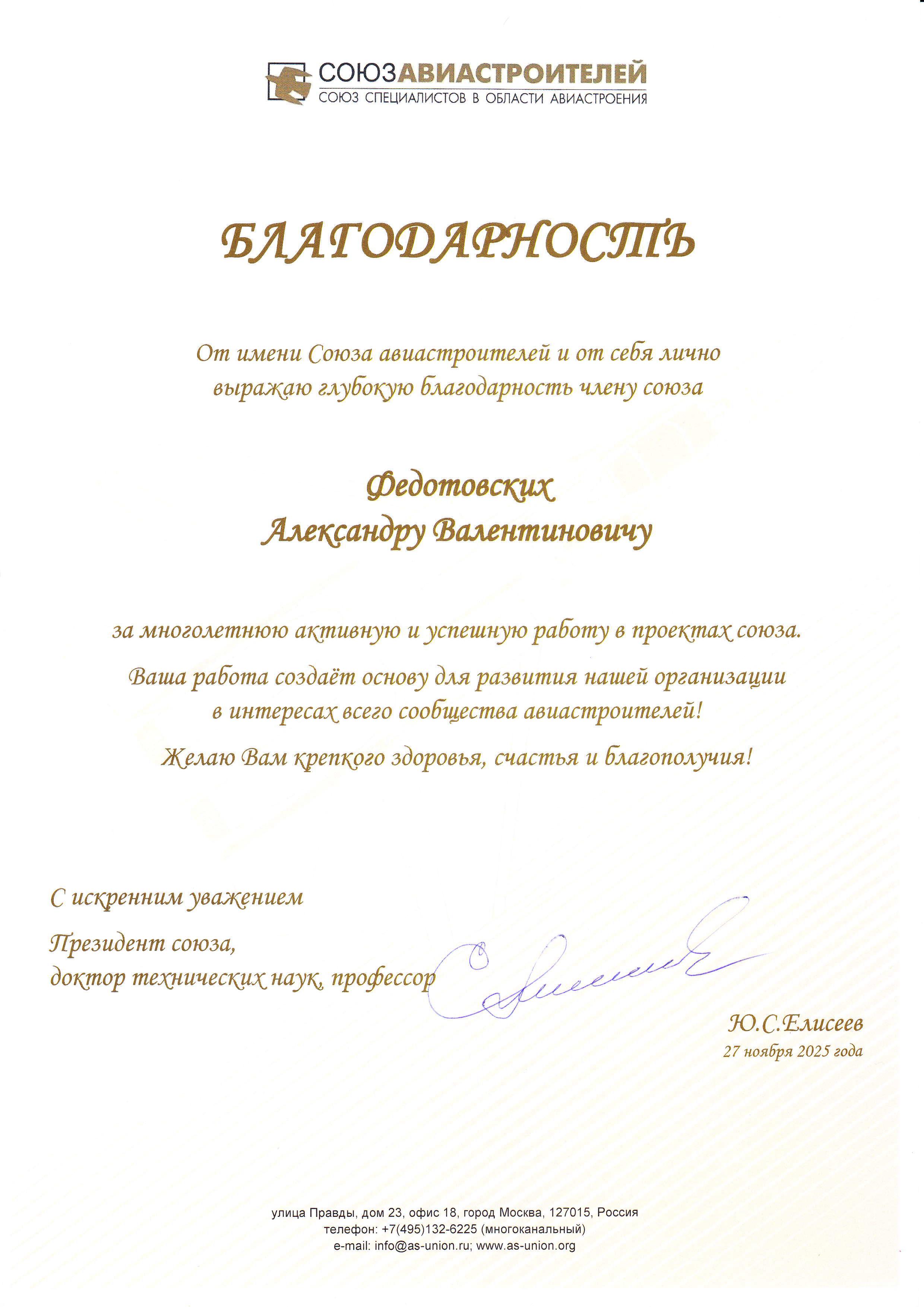 Александр Федотовских отмечен благодарностью Союза авиастроителей